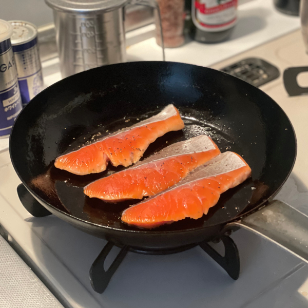 社会人になって初めて購入したフライパンは山田工業所の打出鉄フライパンです。長持ちと鉄分補給のメリットを考えたら、鉄フライパンは何よりもおススメです。使ってから7年目のフライパンは最初より使いやすくなり、油慣らしなども要らなくなりました。確かに長持ちですね!私が持っているサイズは24cmです。大きめの鮭でしたら、2切れがちょうど良いです。写真は小さめの鮭なので、3切れ焼くことができました。1-2人前用におススメです。