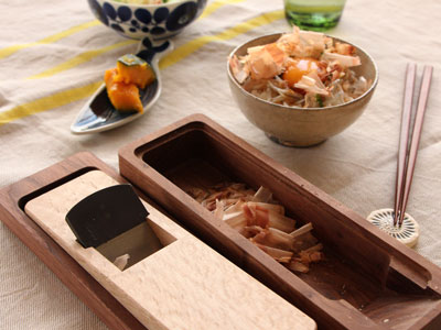 山谷製作所は大工道具の「鉋(かんな)」の台をつくるメーカーとして1946年に創業しました。もともとは鰹節削り用の刃の部分を生産していましたが、和食がユネスコ無形文化遺産に登録されたのをきっかけに和食に貢献するべく、現代のライフスタイルに溶け込む美しいデザインで鰹節削り器を生産するようになりました。ウォルナットとブナを素材とした継目のないつるりとした箱は、鉋台生産者ならではの見事な削り出し製法。長く使え、直すことも可能です。台屋では試し削りをして出荷されているので、お手元に届いてすぐに美味しい鰹節が削れる心遣いも嬉しいですね。