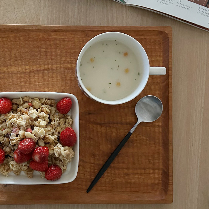 日常で一番使うスプーンがデザートスプーンのサイズ。結婚してから様々なブランドを試しましたが、使い勝手と何より見た目(これ結構大切)で、私にとってのベストなデザートスプーンはクチポールGOAのデザートスプーンでした。匙部分の形は細長い形状が多いですが、GOAはご存知の通りまん丸。この形状により意外とたくさん掬うことができるんですよね。今日の朝食はフルーツグラノーラとカップスープ。両方ともにデザートスプーンでいただきます。小学生の娘のカレースプーンとしてもちょうど良いサイズです。