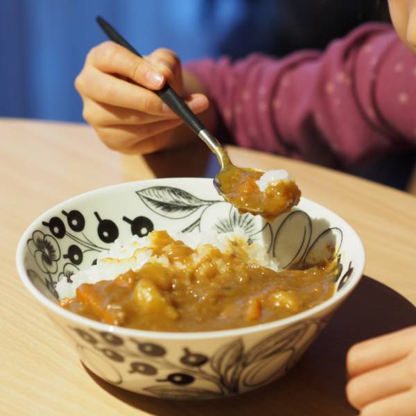 カレーを美味しく食べるためのカトラリーという事でデザインされたスプーンですが、子どもにはデザートスプーンがちょうど良いサイズのようです。最後の一粒まで手を使わずにきれいに食べられたと娘もご満悦!親子でお揃いで使えるのもいいですよね。