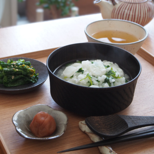 1月7日の人日(じんじつ)の節句に食べる七草がゆ。七草の若芽を食べて植物の生命力を取り入れ、無病息災でいられるようにという願いを込めて食べるとのこと。年末年始に暴飲暴食して疲れた胃を休めるのにも丁度よいやさしさ。小さい頃は草っぽい香りが苦手でしたが、大人になるとこれはこれで楽しめるようになりました。ちなみに七草がゆは1月7日の午前中に食べるのがよいそうですよ。今回は我戸幹夫商店の加飾取椀ビリ筋でいただきます。広めの口なのでれんげでもすくいやすいですよ。