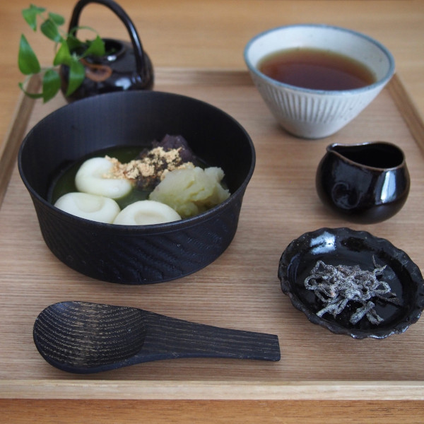 スタッフが京都からおいしいあんこを取り寄せてくれた日に、私もこしあんと白あんを少しいただいて帰りました。せっかくならおいしく食べたいと思い、帰りに白玉粉を買って抹茶ぜんざいにしてみました。使った器は我戸幹夫商店の欅 加飾取椀 ビリ筋Black。浅目で口の広い形状はスプーンですくうデザートにも向いており、少しだけ食材を入れても様になります。側面のビリ筋という斜めに小刻みにつけられた模様も素敵です。