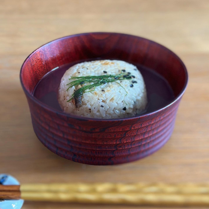 漆器は高価な買い物ですが、軽く手触りの良い感触や破損の心配がないこと、熱いものを入れても「あちち」とならない勝手の良さから後悔しないお買い物になると思います。我戸幹男商店の加飾取椀はなめらかな木肌が美しく、軽いです。ぜひ毎日の生活の中に取り入れていただきたい逸品。浅めの形状で汁物だけではなく色々なお料理を盛り付けることができますよ。写真はスタッフ三木のお料理で稚鮎のリゾットにあさりの濃厚出汁をかけた一品。美味しいお料理が一層美味しくいただけます。