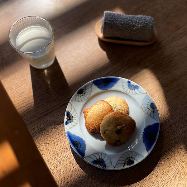 高原さんの人気シリーズの呉須鉄渕花尽くし。縁を彩る藍色の花が、盛り付けたものに華美ではなく控えめに華を添える感じが気に入っています。今日のおやつは手作りクッキー。素朴なクッキーが額縁効果で少し可愛らしく見えてにんまり。自己満足しております。メインディッシュに添えるサラダや朝食の卵料理など、使ってみると毎日のように手に取ってしまうサイズ感。使いやすくて新色が出るたびに買い足しているイッタラのティーマの17cmと同じサイズと分かり納得。