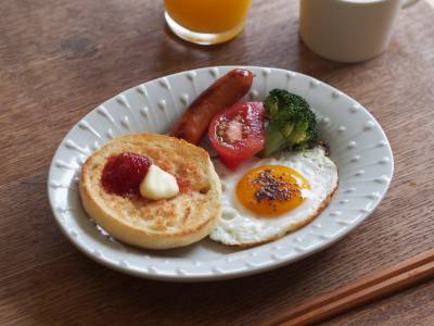 ぐるり縁取る一珍の立体模様が盛り付けた料理を可愛らしく惹きたててくれます。今回は朝食プレートとして使いましたが、夕飯のメインディッシュのプレートとしてもよく使います。スーパーで売られているとんかつ用ロース肉が丁度納まります。わが家の小ぶりな食卓には使いやすい形、サイズです。