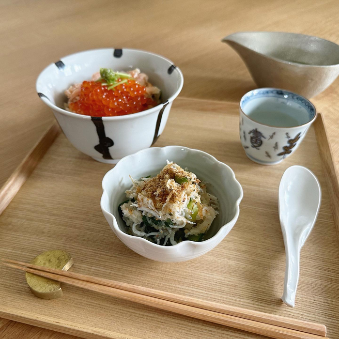 横井さんの「月見草 輪花小鉢」に胡瓜としらすのおろし和えを盛り付けました。まずはこちらで一杯お酒をいただきます。昼間の一杯は、夜にいただくお酒より晴れやかな気持ちになります。小鉢にちょうど良い大きさで、花びらのような縁の造形に「ほっ」とするような手仕事を感じます。お食後のデザートにも似合いそうな器ですよ。「木賊に露 丼」と相性も抜群。なぜなら一緒に作っていただいた作品なんです。ぜひ丼のお供にしてあげてください。