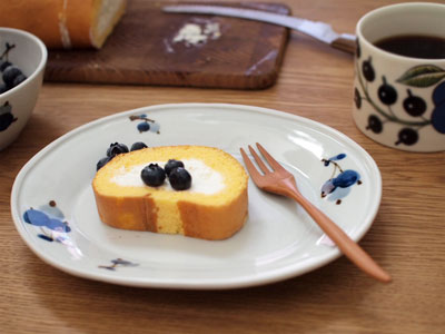少しゆがんだ楕円のお皿にひとつひとつ手描きでかかれたブルーベリーがかわいいです。ケーキ皿には少し大きいかな?というサイズ感ですが、余白があることでフルーツと合わせたりクリームを載せたりも。パラティッシとも合いますね。