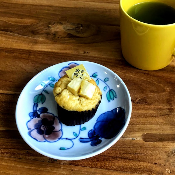 色絵のお皿ですが、おさえた色味がもりつけた食材を引き立ててくれます。12cmという大きさは食事時には取り皿としてもちょうどいいし、ちょっと休憩なんて時にお茶菓子をのせるのにもぴったりです。和食器だけどケーキにもあいますよ。今日は築地のさつまいも専門店芋菓子しみずのさつま金時のスイートポテト!食べ終わったあとも絵柄がかわいくって、ついついながめてはニコニコしてしまいます。