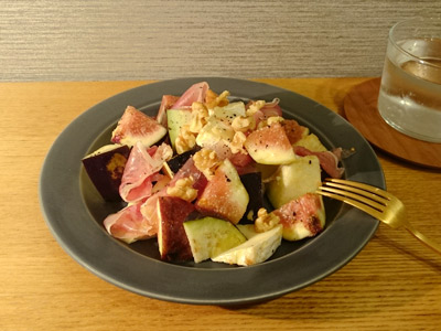 何かと出番が多いのはプロキッチン別注カラーのディムグレー。ブラックもそうなのですが、お皿が暗めの色味だと切って盛り付けただけの食材でも美味しそうに見えてしまうのはなぜだろう?今夜は大好きないちじくと生ハムとチーズのサラダで晩酌です♪