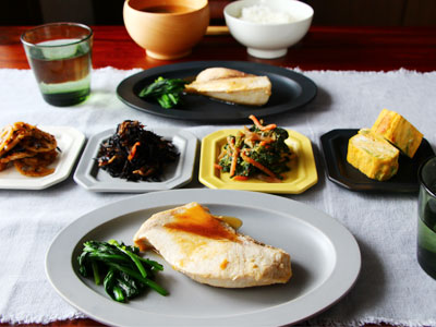 SAKUZANのオーバルプレートに煮魚とお浸しを盛りつけました。リム部分が太めなので料理を引き立ててくれます。一品料理が載るシンプルなオーバルプレートは意外にないのでこんなお皿待ってました!!