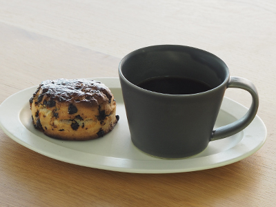このコーヒーカップは程良いサイズ感で、口当たりもいいんですよ。釉薬がかかっている様も個体差があってそれもまたいいんです。プロキッチンオリジナルカラーのディムグレーは深まる秋にぴったりの色。ソーサーにはオーバルMのクリームを使ってスコーンをのせれば即席おうちカフェ時間です♪