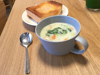 冬場は朝食にあったかい汁物をとるようにしています。寒い朝でもあったかさがしみわたり、1日頑張れるような気が。SAKUZANのスープカップは口が広く、浅型なのでまさにスープにぴったりです。前の晩の残りものを温めているのでお味噌汁のことも多々ありますが、今日は豆苗をいれたクリームシチューでした。