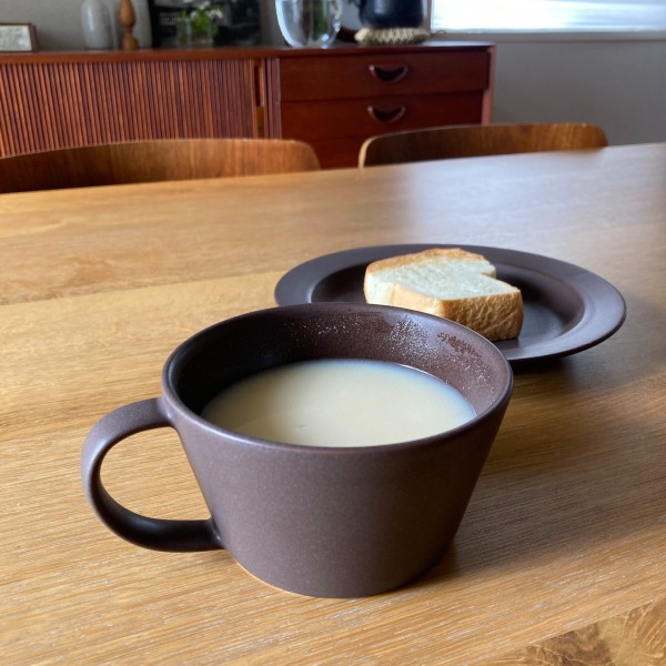 春になっても時々花冷えで肌寒い朝にはあったかい汁物が欲しくなります。インスタントスープでも温かさがしみわたり、1日頑張れるような気が。SAKUZANのスープカップは口が広く、浅型なのでまさにスープにぴったりです。容量が大きいのでミルクたっぷりのカフェラテや紅茶にも◎。プロキッチン別注のチョコレートブラウンはARABIAの人気シリーズ、Ruska(ルスカ)の色をイメージしたもの。クリーム色の飲み物が映えますよ。