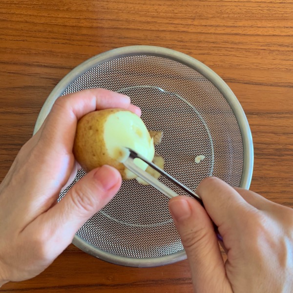 このI型ピーラーは果物の皮を剥くように使うのがポイント。特にじゃがいもなどの丸い形のものに威力を発揮し、スルスルと皮を剥くことができます。先端を使えばじゃがいもの芽をとることができるし、余計なパーツがないから汚れが溜まりにくく洗い物だってらっくらく。T型ピーラーと併用して使ってもいいと思います。