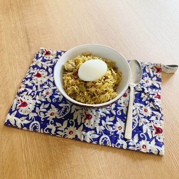他のスタッフは「どんな柄持ってるのかな?」とチラチラ見てるんですが、人の柄って良く見えますね(笑)小さめのサイズがワンボウルランチやティータイムに丁度いいです。柄は裏表で違うので3枚入りで6種の柄が楽しめます。どんな柄が来るかは届くまで分かりません。それが楽しみで注文してみました。一番気に入っているのは「刺繍糸のステッチ」。このステッチが温かみのある雰囲気にグレードアップ。ちなみにこの日のワンボウルランチは「ケイジャリー」イギリス式カレーピラフです。