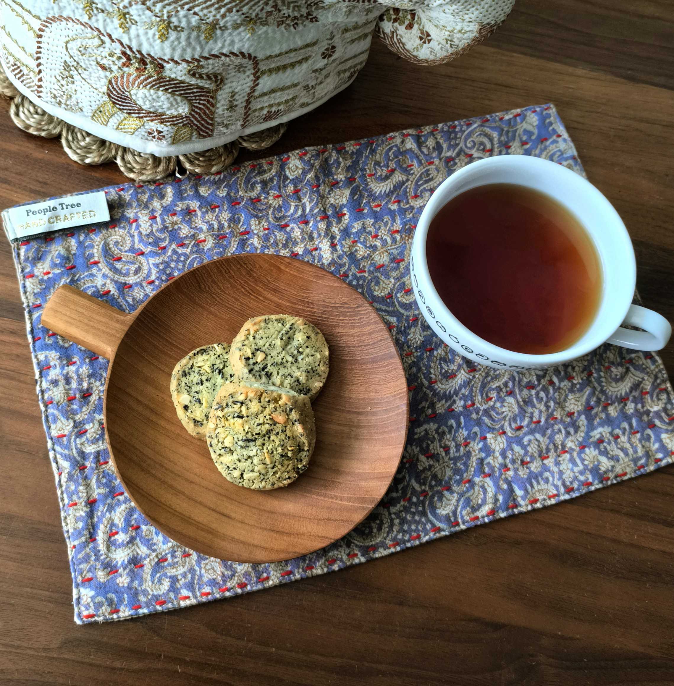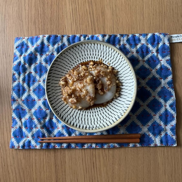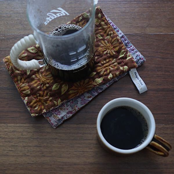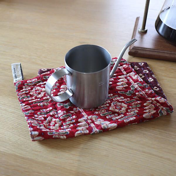 一番気に入っている点は肌触りです。リサイクルサリーなだけあって肌になじむさわりごこちだから鍋つかみにしたり、拭いたりするときにさっと手に取りやすい。吸水性もばっちり。ちょっとしたおやつマットとして敷いておくと、飲みこぼしや食べこぼしにも対応でき機能的なのに柄がかわいいから気分もアガります。裏表ちがう柄で3枚あるので6パターンの雰囲気を楽しめ、気分によってどの面を使おうかな~と考えるのも楽しいです。作家さんの器によく合う柄が多いのでうれしいです。