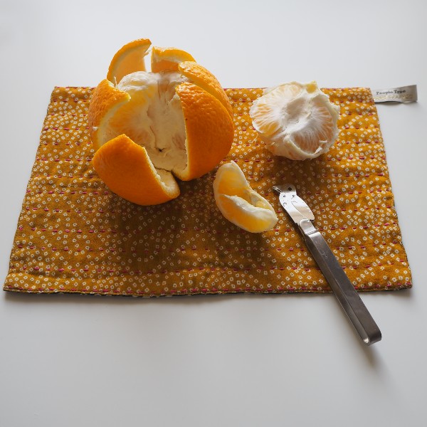 こちらのマルチクロスは卓上で柑橘を食べるとき特に重宝しています。食器用ふきんやランチョンマットではシミが気になり、お皿では後片付けが面倒で…。このクロスは多少果汁でシミになっても目立たず、くたびれてきたら台拭きにすればいいから、と思い切り使えます。表と裏で色柄が異なるので、気分によって選べる楽しみも気に入っているポイントです。おやつや軽食の時はランチョンマットやティーマットとしても使っています。私のところへやってきた3枚は渋めのカラーで、画像のクロスの裏側は濃い緑色です。色柄はお選びいただけない点はご了承くださいね。