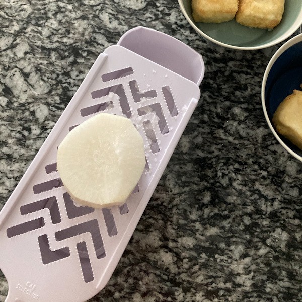 貝印のおろし器はプロキッチンスタッフで使ってみたときに「おろしやすい!」という意見で一致したおすすめの一品。角度がついたプレートやすべりどめがついた受け皿など力がいれやすく、思っているよりもあっけなくすりおろせるんです。それまで100均のおろし器を使っていたからというのもありますが、大根おろしなどを作るのは疲れる作業だと思っていて敬遠していました。でも貝印のおろし器の導入で使うハードルが一気に下がりました。先日は無性に揚げ出し豆腐が食べたくなりみぞれづゆを作るのに使いました。