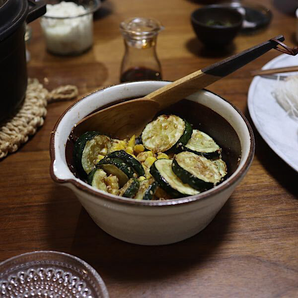 このすり鉢を買ってから、我が家ではすり胡麻は買わず、使う分だけその都度胡麻を摺るようになりました。 この日は、摺った胡麻に茹でたとうもろこしとさっと揚げたズッキーニを和えて、お醤油とお砂糖で味付けをした簡単レシピ。摺りたての胡麻は香ばしくよりおいしくなりますよ。 そのまま食卓に出して出来立てをいただきます!