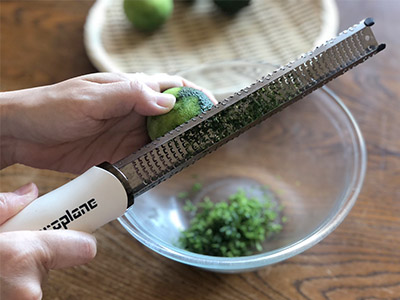 はじめて柚子胡椒作りにチャレンジしてみました。マイクロプレインのグレーダーを使って皮を削るというレシピがあったので早速チャレンジ!力を入れることなくやさしく滑らせるだけで青い部分だけあっという間に削ることができました。グレーターについた皮もボウルにトントンとするだけで簡単に取れました。