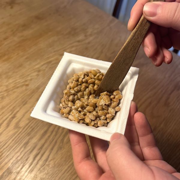 こんな写真をお見せしていいのかわかりませんが、毎日使うたびに便利だなーと思うので、ご紹介させてもらいます!サッカーをがっつりやっている高校生の息子が毎朝食べるのが納豆に卵を混ぜる納豆ご飯。納豆はまず、発泡スチロールの容器で30回ぐるぐると混ぜてから、卵を溶いておいた器に入れて混ぜるのですが、お箸で混ぜると穴が開いちゃったり気をつかっちゃうけど、これがとっても混ぜやすいんです。もちろんバターナイフにもかわいいし、もう何年も使いすぎて木が黒く成長してます(笑)