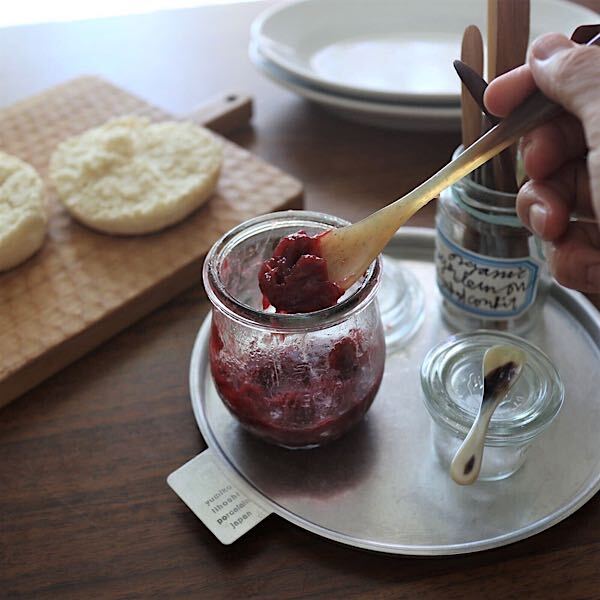 ジャム用のスプーンはいくつか持っていますが、新しくお迎えしたこのホーンカトラリーがとても使いやすくてつい手に取ってしまいます。自家製のルバーブのジャムはしっかりとろみがあるのですが、このカトラリーならたっぷりとすくえます。口当たりもいいのでヨーグルトを食べるときにもおすすめです。天然のものなので模様には個体差がありますが、何本か揃えて個性を楽しんでみるのもいいですよ。