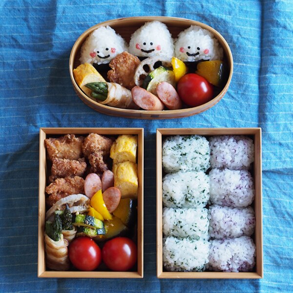 4年目に突入した娘のお弁当作り。前日の夕飯の残り物や冷凍食品に助けられ、何とか続けられています。一番気をつけている事は彩り。蓋を開けた瞬間の事を想像しながら盛り付けています。俵形に握ったおにぎり2つは食べやすいようにと娘からのリクエスト。曲げわっぱと違い俵形おにぎりもスッキリと収まり、浅めの形状が盛り付け中に崩れたりせず詰め込んでいけます。お重がそのまま小さくなったので、菓子器として和菓子を入れたり、お正月にはかまぼこや伊達巻きを盛り付けたミニお重としても使えますよ。