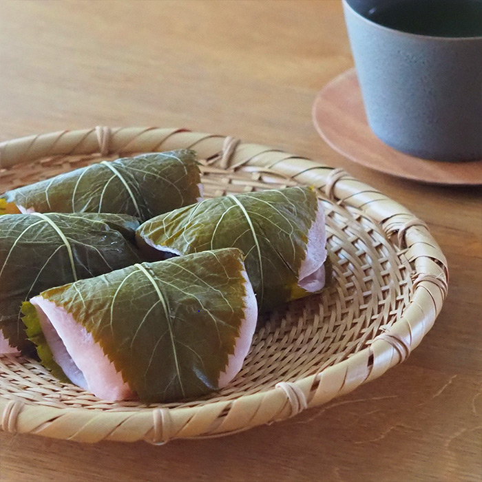 桜餅をつくってみました。娘のリクエストに応えて初めてつくる関東風の桜餅です。小麦粉に白玉粉と家にある材料で作れることを初めて知りました。フライパンで一枚一枚焼いていくのですが、クレープを焼くように端がめくれ上がってきたタイミングでひっくり返すということが次第にわかってきました。おもしろいように量産される桜餅。そばざるを菓子器にして盛り付けます。「今日は好きなだけ食べていいよー」餡子も手づくり、甘さも控えめな桜餅です。