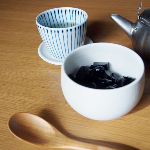 コウシャのフタックは蓋をして重ねることができるので、ごはんのお供や残り物の保存だけでなく、ゼリーやババロアなどの冷やしかためるデザートを作るときにも重宝します。ころんとした丸い形もとってもかわいく、蓋は小皿や茶托としても使うことができる優れモノです。こどもたちが大好きな黒豆はおせちの時以外も年に何度か作るのですが、その時に残る煮汁もゼリーにしました。レモンシロップをかけるのでさっぱりした後味です。