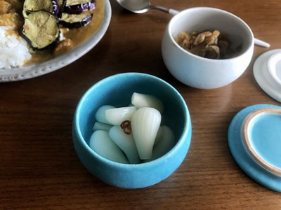 初めて漬けたらっきょうを食卓に迎えるのにあたり、選んだのは、コウシャのフタック 蓋物 Sサイズのブルー。白く可愛いらっきょうがとてもさわやかに映えて、和洋問わずに食卓に似合います。