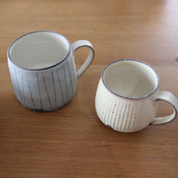 陶器市用に特別に作っていただいたこのマグカップ。「インディゴマグカップ」はたっぷり入るサイズです。一緒に作っていただいた「しのぎマグカップ」はこぶりで思わず両手で包み込むように持ちたくなるコロンとしたサイズ。この2つ、セットにしたらお似合いの夫婦みたいじゃないですか?まるでココチ舎の市野さん夫婦みたい!と思っちゃいました(ご夫婦の様子はぜひブログをご覧くださいね)このマグカップをセットにして結婚祝いや金婚式、銀婚式などのお祝いの贈り物にも良さそう。ぜひペアマグカップとして使っていただきたいマグカップです。