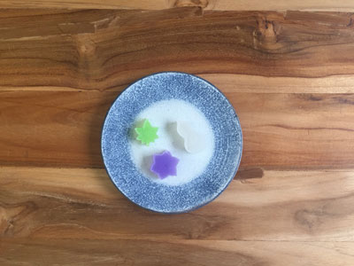 夏休みに、京都に行ったときに買った「七條甘春堂」の干菓子「京の夏琥珀」を並べてみました。 寒天と砂糖でできていて、淡い色合いはまるで宝石のよう。そんな綺麗な和菓子も、このプレートにのせるとますます透明感が増して、粋に見えます。