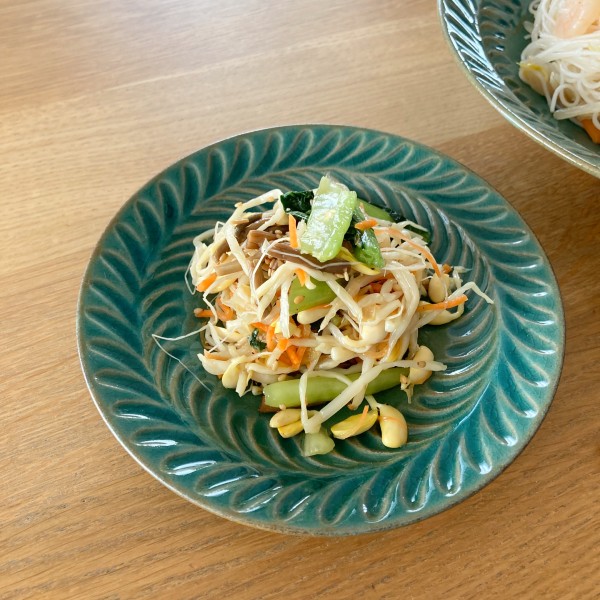 市野さんのトルコブルーは少し緑がかっていて、縁にある葉紋とよく合っています。つやのある色がクリーム色の食材を引き立たせてくれ、海鮮ビーフンがおいしそうにランクアップしました。深さがあるので汁気の多い料理やパスタをのせるのにぴったりです。ガラスのような光沢と貫入がとても美しく、うっとりと眺めていたい器ですが、電子レンジで温めができて和食器初心者の私にもやさしいです。作家さんの器はなかなか入荷しないので、みつけたら早めにゲットをおすすめします。