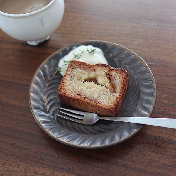 市野耕さんのマンガン釉は、渋めの鉄のような風合いがかっこいいのでお気に入りの器。葉っぱ模様のしのぎのデザインも、盛り付けた食材を際立たせてくれます。我が家では取り皿として使うことが多く、特にパウンドケーキのような焼き菓子をのせるとほくほくした感じや焼き色がおいしそうに映えるんです。アンティークのような雰囲気もあって渋さもあるけどこうしておしゃれに盛り付けてティータイムにも大活躍です。