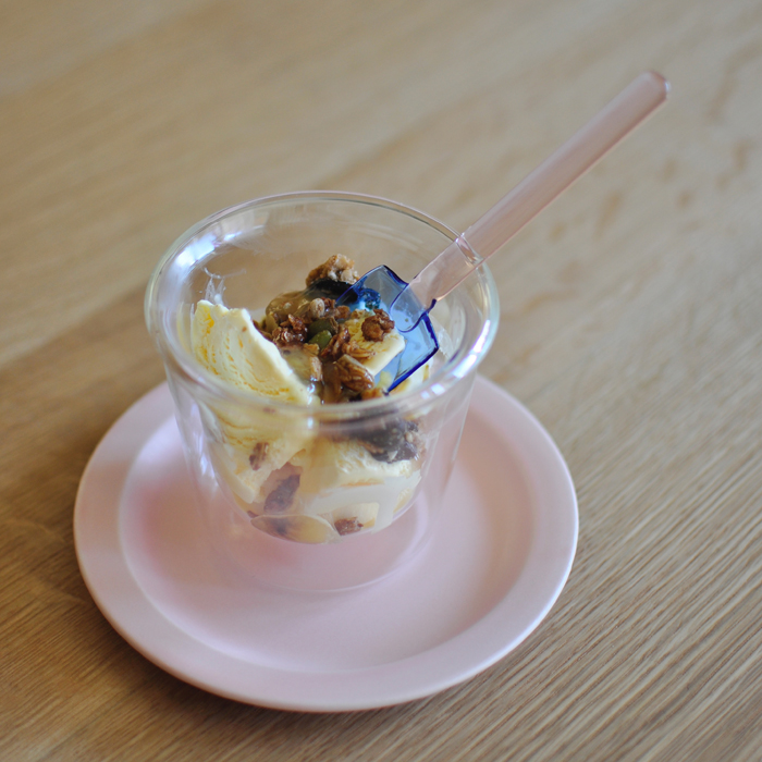 アマブロのSNOW SHOVELはその名の通り「アイス」にピッタリ。ガラスの優しい口当たりはステンレスや木製ともまた違って、ひと口運ぶごとにニコニコ。キントーのダブルウォールをデザートカップにすれば温度を長く保てるのでアイスクリームも溶けにくく、温かいお部屋でも最後まで美味しくいただけます。グラスとガラスのスプーンは良いコンビネーション!SNOW SHOVELは可愛らしい箱入りなので小さなギフトにもおすすめです。
