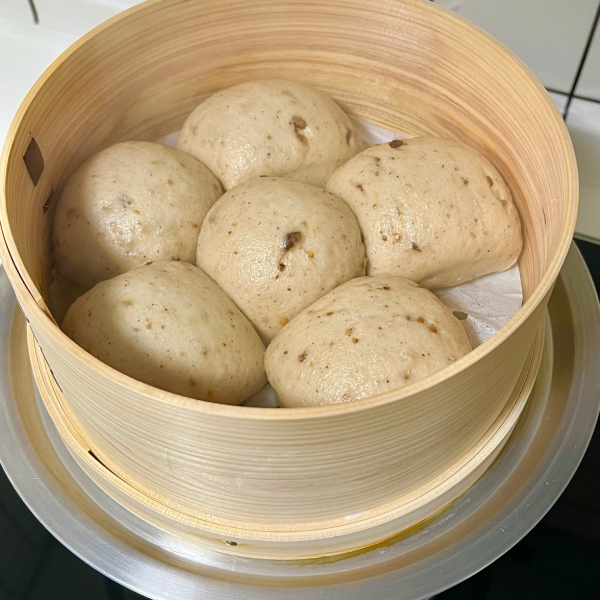 和蒸篭の使い方として、蒸し野菜と茶わん蒸し以外にも、肉まんや中華風饅頭にも使っています。中華蒸篭ではないけど、使い方はだいたい変わらないです。こちらの写真は自家製の中華風饅頭で、小麦粉(250g)に少量のくるみとナツメが入ってます。21cmは小さいイメージがありますが、実はまんじゅう6個も作れて、ちょっと意外でした。また、まんじゅうの食べ方も色々あります。炒め野菜と合わせて食べたり、長崎風の角煮まんじゅうを作ったりします。食べきれなかったら、冷凍保存もOKです!ご興味がありましたら、ぜひ作ってみてください。