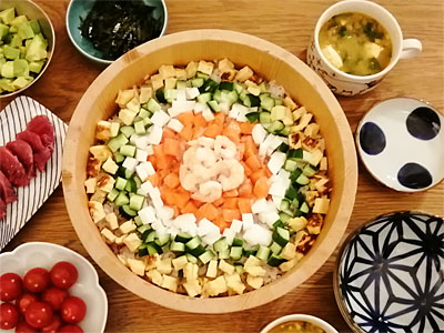 飯台持ってますか?持っていない人はぜひ!飯台って大きいイメージがあると思いますが、これはわりとコンパクト。酢飯がおいしくできるのはもちろん、ケの日にはこんな風に安い具材を切って並べるだけで見た目も楽しいちらし寿司になりますよ。一家に1台オススメです!