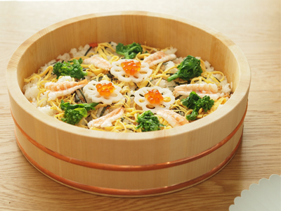 ちらしずしって簡単に出来るし、作り置きもできちゃうし、テーブルに出しておくと華やかになりますよね。木曽のさわらを使ったこの飯台は、作りが丁寧でとても美しく、テーブルで主役になってくれますよ。