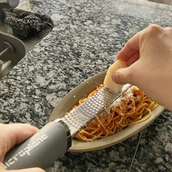 はじめて出会ったのは料理教室で。まるでレストランで出されるかの様なふわふわチーズが削れてゆく様に感動しました。チーズ以外ではレモンや柚子などの皮を削ってお料理にかけたりするのにも良い道具です。まずはパルメザンチーズをパスタに削ってみました。「ストップと言ってね〜」なんて言いながらたっぷりかけるのが、ちょっと贅沢気分で楽しかったです。