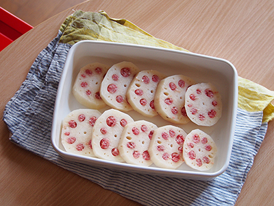 浅型は冷蔵庫内でも重ねやすく、衛生面でも安心です。今日はレンコンの肉詰め。きれいに洗ったレンコンの穴に豚ひき肉を詰め、1cm幅にカットしてフライパンで焼くだけ。脂身の多いひき肉だとお肉が縮んで穴から抜けてしまうのでご注意を。レンコンのシャキッとした歯ごたえが堪りません。辛子醤油で召し上がれ。