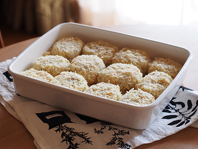 夕飯の下ごしらえに便利なホワイトシリーズの浅型。あとは揚げるだけの状態のポテトコロッケを容器に並べ、蓋をして冷蔵庫へ。時間が経ってもパン粉がベタッとしないのが不思議。形状がバットにも似ているのでパン粉付けにも浅型を使用。保存容器+バット+オーブンウェアと、ひとつで3役の優秀な保存容器です。