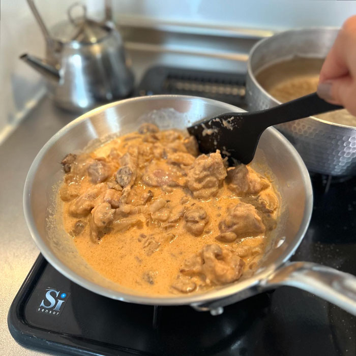 スタッフ三木のおすすめにより、中尾アルミ製作所のアルミフライパンでパスタソースを作っています。今回はチキンクリームにスパイスのパプリカを効かせたクリームソースパスタ。クリームソース作りのポイントになるのは「煮詰め加減」。とにかく一度煮詰め切ってからパスタの茹で汁などで濃度を調整します。ここでアルミフライパンの熱伝導が良さが実感できます。茹でたパスタを手早く和えて全体に絡まったら完成。ソースを混ぜているのはサンクラフトのシリコンスパチュラ。このスパチュラも三木大絶賛中ですのでスパチュラ迷子の方に是非お試しいただきたいです。