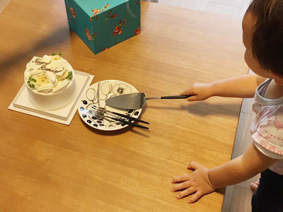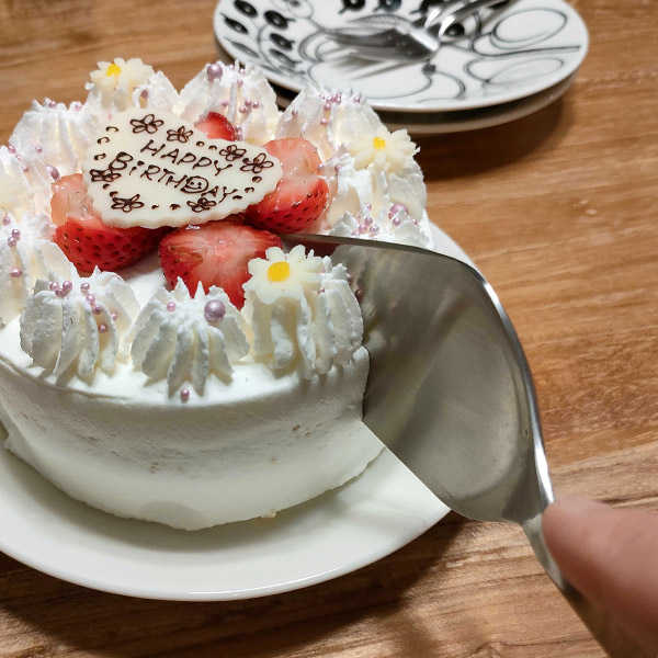ホールケーキは年に数回しか買わないからケーキサーバーに興味すらなかった私。「ホールのケーキって特別な日しか買わないのに上手に取り分けできなくて落ち込むから買った」との友人の一言にハッとしてお迎えしました。まず、箱の台座からお皿への移動の安定感。広い柄が握りやすいです(ケーキは4号)。切り分けたケーキも各自のお皿にお行儀よく着地。なるほど、数回しかない特別な日だからこそ必要なアイテムなんだと納得しました。最後にちょっと残念ポイントを。このサーバーにはケーキをカットできる刃があります。切れ味は悪くないのですが断面は普通のナイフの方がキレイです。この写真は最初で最後のカットの記念とします。