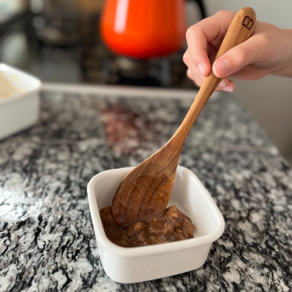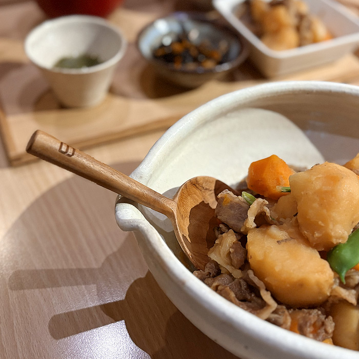 その日の体調によって食べられる量が変わるので、わが家ではメイン料理を取り分けスタイルにすることが多いです。この日のメインは、家族全員が大好物の肉じゃが。おたまのように深さがないのが逆に良い点で、ジャガイモも崩さずにきれいに取り分けられて感動しました。直径8cmのサジ部分は、見た目以上にたっぷりとすくえますよ。また、柄が短めなので、食卓でも邪魔にならず使いやすいです。チーク材は耐久性と耐水性に優れているので、オイルで手入れをしながら長く大切に使っていきたいと思います。