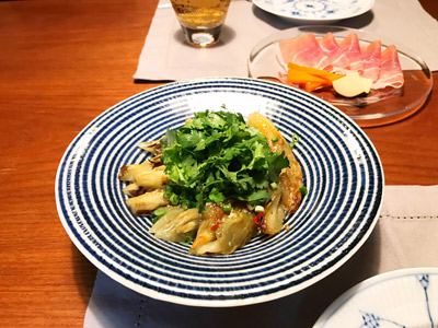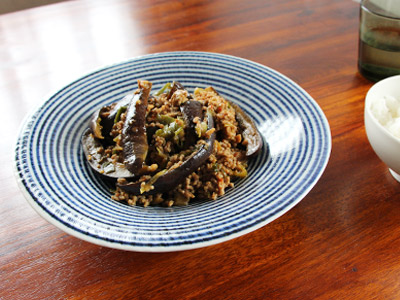 存在感のあるこの大鉢は、地味な色合いの料理をさまになる一皿にしてくれます。器により料理の印象が変わることをあらためて感じます。盛り付けている料理はベトナム料理の焼きナス。程良くタレが底にたまって最後まで美味しくいただけました。