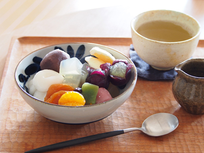 デパ地下であんみつを買ってきました。浅過ぎず深過ぎず、ちょうど良い深さのいろはの中鉢。民芸っぽい雰囲気もあんみつにぴったり。「確か白玉粉があったはず…、バニラアイスもあったかな」。結局旬のフルーツも添え、柄が見えないくらい山盛りのあんみつになりました!