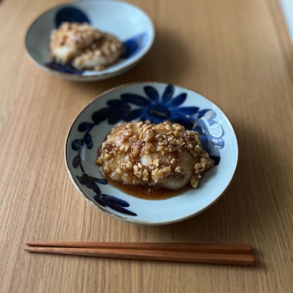 BARBARのいろはシリーズはグレーがかった白磁に呉須で絵付けされている様子がのびやかでほっこりする器です。中皿は取り皿にも、お菓子やおにぎりをのせるのにもちょうどよいサイズ。深さがあり、汁気のあるものもOKなので今の季節はおもちを食べる時に活躍します。おもちはのりとチーズで食べるのが一番好きなのですが、飽きてきた時に作るのがくるみもち。すったくるみに砂糖とお醤油、シナモンを加えて煮もちをからめると冬にちょうどよいおやつになります。