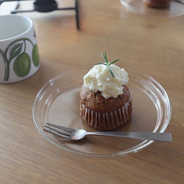 キャロットケーキを焼いたのでこのガラスのプレートに載せてみました。小ぶりのマフィンを載せるのにちょうどいいサイズ。ガラスのプレートって分厚くて重くてちょっと気軽に使いづらいイメージですが、このプレートはとにかく薄くて軽い!スタッキングしても嵩張らないので何枚も揃えたくなります。しかも耐熱ガラスなのでレンジで温めも可能。焼き菓子などもちょっと温めておいしくいただけますよ。