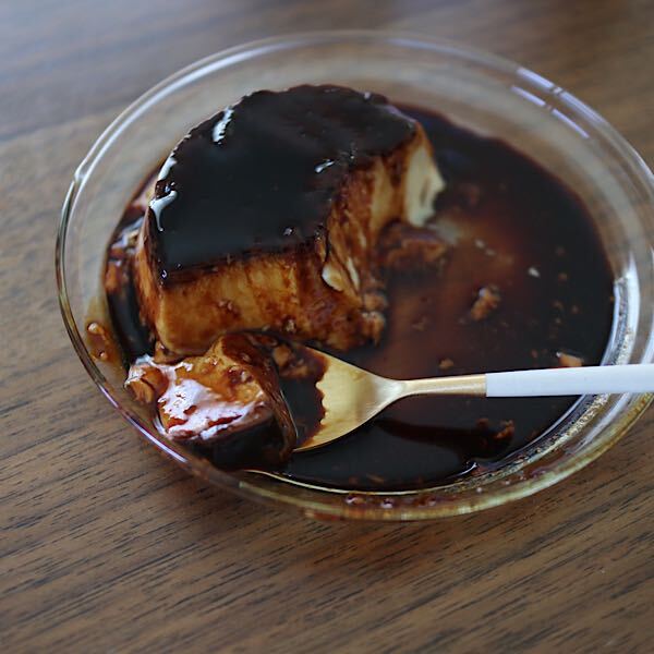 このガラスプレートは思ったよりも深さがあるので、汁気のあるものもすくいやすいのがいいところ。こんなふうにプリンのカラメルもこぼさず最後の最後まですくいとれるんです。テーブルを汚さないで最後までおいしくいただけます!