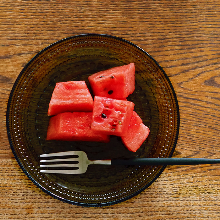 義両親のところに帰省したので頂いた食材で冷蔵庫に夏が溢れています。今日はカットして食べやすくしてキンキンに冷やしたスイカをおやつにしました。カステヘルミは冬にも合うガラスだと思いますが、もちろん夏にも◎。ダークグレーは真っ赤なスイカとも相性が良く、目にも涼しげで少し酷暑を和らげてくれます。